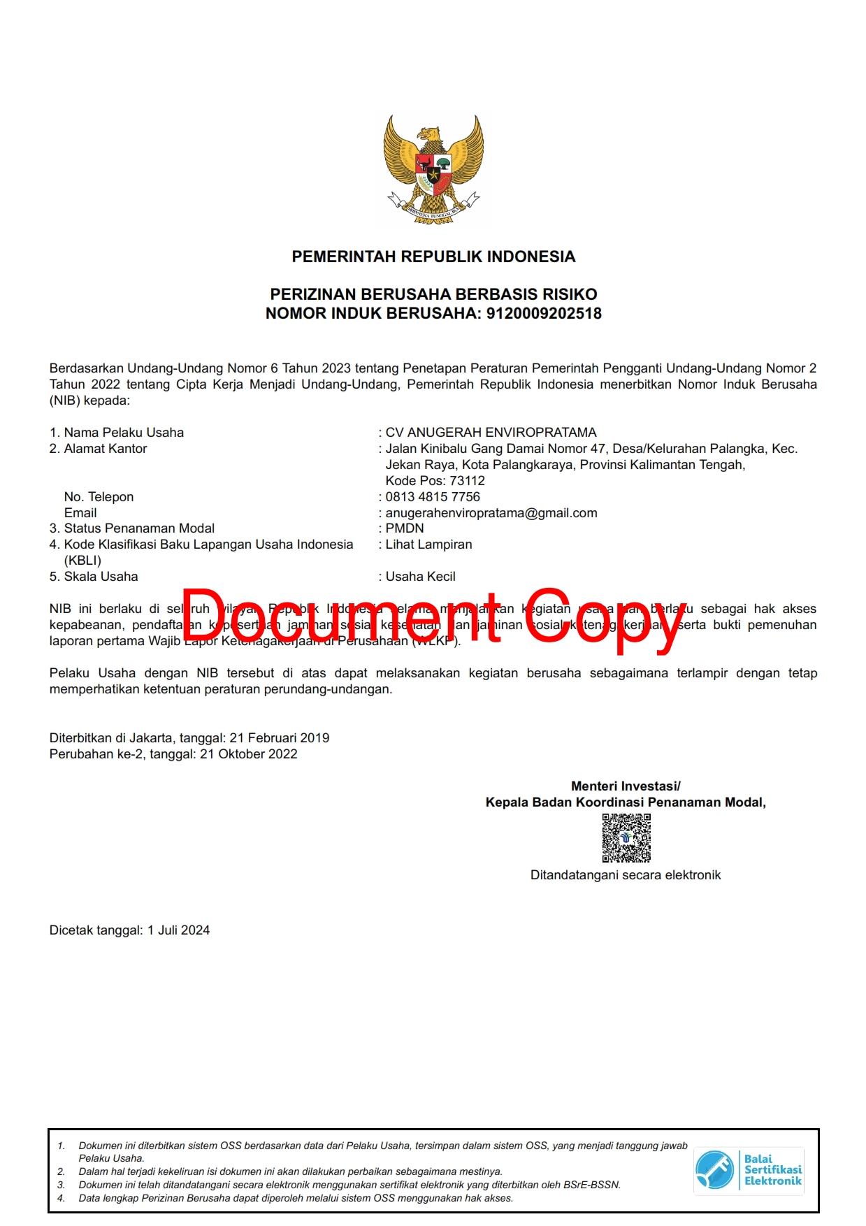 Nomor Induk Berusaha (NIB) OSS