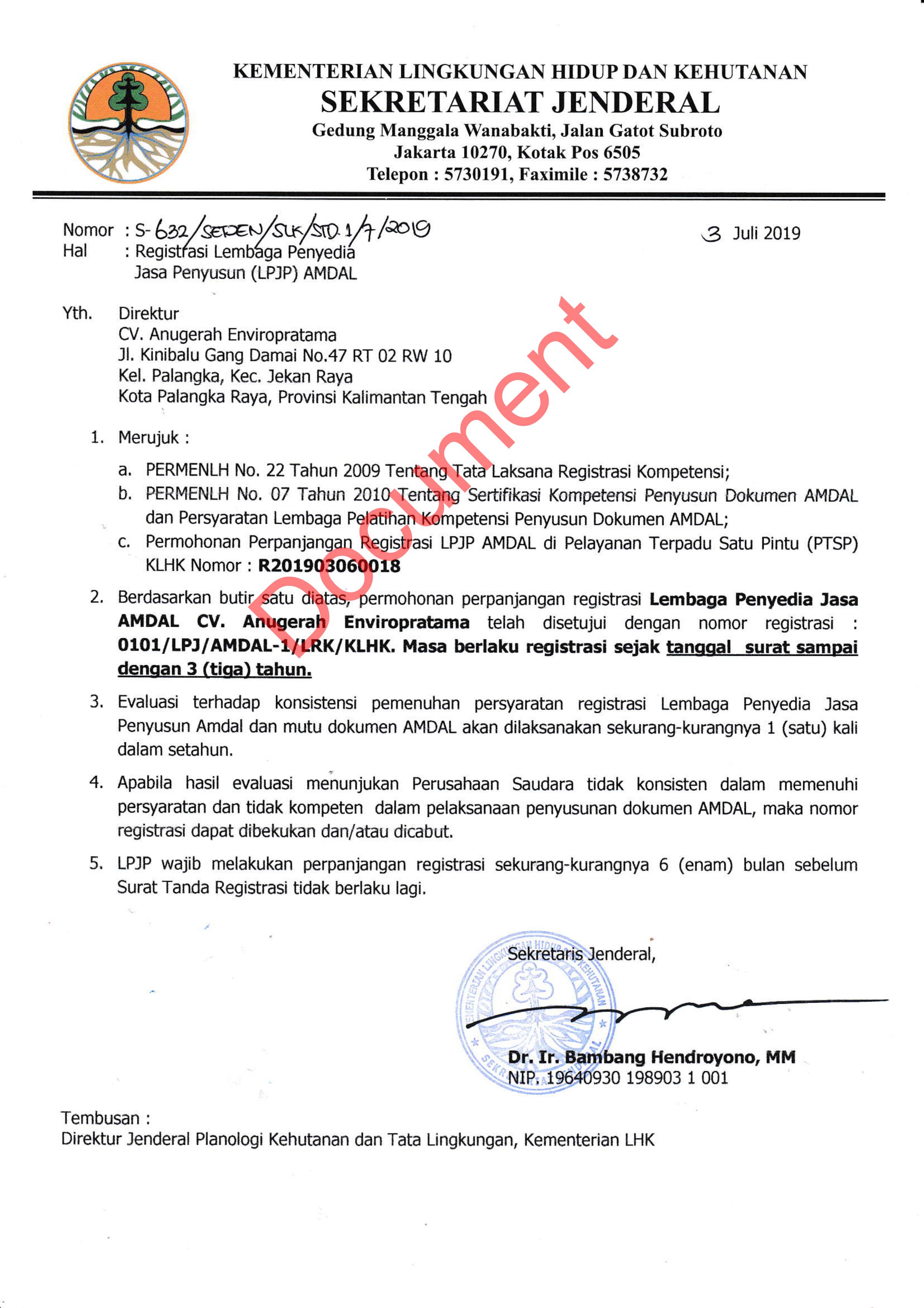 > Sertifikat Lembaga Penyedia Jasa Penyusun (LPJP) AMDAL